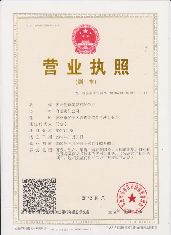 苏州创新陶瓷有限公司(INNOCERAM CO., LTD. SUZHOU)成立于2007年,注册资本500万,占地面积3万平方米,并由丰富工作经验和知识的高等陶瓷相关人士团队建立和管理并,致力于大部分国家的陶瓷技术,推动行业进步。 苏州创新陶瓷本着全心全意为客户服务的宗旨,秉承创新的精力,以客户利益为重的口碑,注重产品质量和售后服务,已经在国内市场占有很大比例,也形成了自己的口碑,品牌和知名度已经于同行业的厂家。目前苏州创新主要合作的客户包括北玻、福耀、信义等国内知名钢化炉生产厂家以及玻璃深加工企业。 苏州创新陶瓷已经成功申请了“江苏高新技术企业”,产品通过了ISO9001:2008质量管理体系认证,并获得多项专利发明。创新陶瓷可加工小到直径15mm的辊道,大到直径300mm的浮法辊道,根据客户需要进行加工定制。