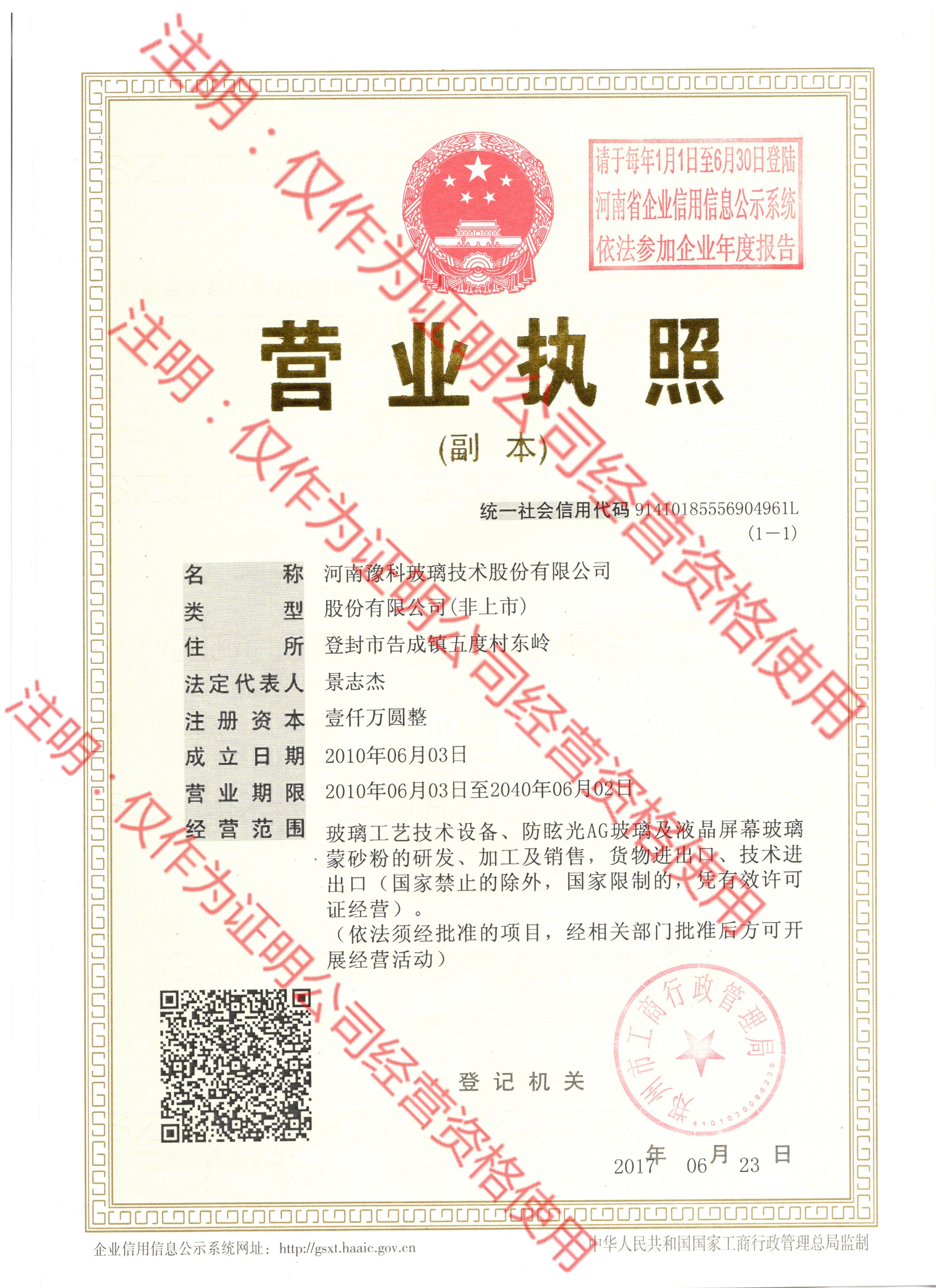河南豫科光学科技股份有限公司,创立于1995年,总部位于河南省登封市。是一家有经验从事防眩光(AG)玻璃、玻璃蒙砂粉、自动蒙砂生产线和3D精雕的研发、生产和销售为一体的高新技术企业。公司于2017年11月13日在全国中小企业股份转让系统(新三板)正式挂牌。(股份公司凭证名称:豫科光学,股份公司凭证代码:872383)在20余年的发展历程中,公司先后获得“河南省创新型试点企业”、“高新技术企业”、“河南省电子商务企业”、“国家科技型中小企业”,并于2014年承担国家科技部中小企业创新设立资金项目。公司参与起草与编制的《建筑用装饰玻璃术语》国家标准于2019年5月1日正式实施。公司目前已申请专利160多项,其中授权专利37项;拥有科技成果两项:其中“液晶屏幕玻璃蒙砂粉的研制与应用”项目获得“郑州市科学技术进步奖二等奖”和“河南工业和信息化科技成果奖二等奖”;“纳米级无闪点防眩光玻璃的研制及应用”项目也已于2018年12月通过国家工业和信息化部项目成果评价,达到全部先进水平。公司从事玻璃蚀刻技术多年,拥有自主研发能力,建有河南省AG触屏玻璃工程技术研究中心。期间为德国奔驰、德国肖特、美国康宁;中国张裕、五粮液、古井贡等知名企业做定制化开发,致力于为大部分国家客户提供玻璃蚀刻技术的整体解决方案。