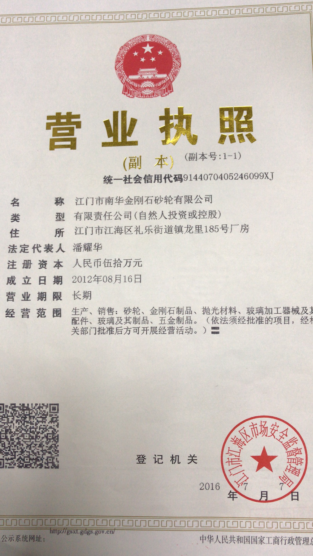 江门市南华金刚石砂轮有限公司,自成立以来一直致力于玻璃磨具的研发与生产,经多年努力,已成为集生产、研发、销售于一体的综合性企业。 本厂有经验生产各种玻璃磨轮,产品主要包括金刚轮、树脂轮、抛光轮、钻头等。产品适用于各种异型机、直边机、斜边机、波浪机、双边机等等各种设备。针对国内外市场的要求,生产订做各种产品。 我们将继以“质量靠前,用户至上”的经营理念,与新老客户秉承合作,共创未来。