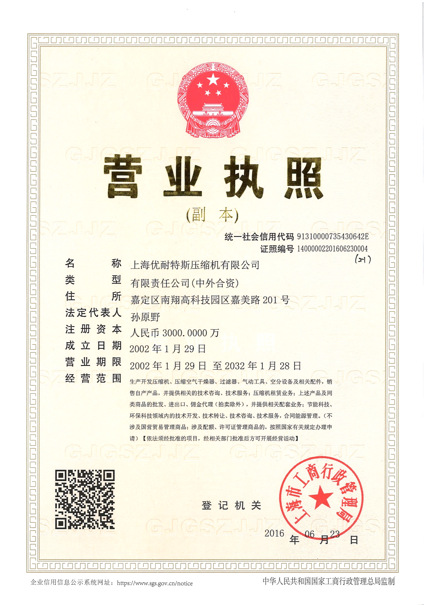 上海优耐特斯压缩机有限公司创建于2002年初,是国内有经验生产双螺杆压缩机的大型生产制造企业,也是空气系统解决方案的可靠提供商。 公司位于上海市嘉定区南翔工业园区,注册资金3000万元,优耐特斯可提供UD系列功率为5.5kW-630kW、容积流量为0.69m3/min~120m3/min的风冷(水冷)螺杆式空压机、变频螺杆式空压机、螺杆式工艺压缩机(氯乙烯/煤层气/伴生气)和特殊压缩机(螺杆式喷浆用/矿山用空压机、低压螺杆式空压机、中压两级空压机和活塞式高压机),亦可提供空压机站的全套施工方案,已具备设计制造、服务支持、用户培训和主机大修等整套服务项目的能力,公司为加强经销商、客户与企业的联系,开通400 889 6699免费服务联络方式,在全国各地设立30多家分支机构与经销商团队,一体满足用户的各种需求。