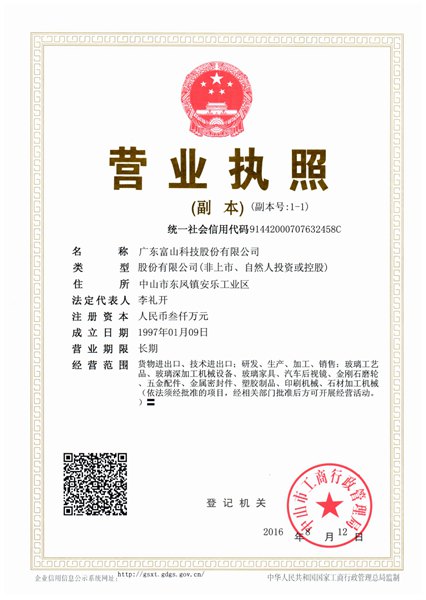 广东富山科技股份有限公司是能单独设计开发和研制生产具有全部先进水平的玻璃深加工设备、智能装备、环保设备的企业。始建于一九八八年,占地面积五万多平方米,是从事建筑、太阳能、家电、家具、汽车玻璃等行业的一站式合作伙伴,能为客户提供有经验的整套设备解决方案。 公司具有雄厚的技术实力和精良的加工设备,并与多家大学和科研院所长期合作,开发应用先进技术,不断提高产品档次,带领市场需求。30年来一直专注于玻璃深加工设备的研发、制造,其中多项技术获得国家及国外技术专利,较好,并有多个产品的开发获得科技进步奖项。目前公司主要产品有:N3CFBT系列强制对流平/弯钢化玻璃生产线、FT系列辐射平/弯钢化玻璃生产线、汽车双曲面玻璃生产线、夹层玻璃生产线、切割线、后视镜磨边生产线、高等无链条结构磨边机、快速双边磨、高速四边磨以及其他各类磨边机、钻孔机、清洗机以及喷砂机等。 公司通过ISO9001全部质量体系认证和CE欧洲安全认证的企业,并严格遵循以顾客为中心,以优良的产品和完善的技术服务赢得了广大客户的信赖和支持。产品畅销海内外100多个国家和地区。富山品牌一直被评为“广东省有名商标”称号,公司连续多年被评为“高新技术企业”。 未来,公司将充分利用资本市场的力量,继续规范运作、加大研发投入、完善资本结构,并开拓融入资金渠道,实现快速健康发展,为行业发展作出应有的贡献。