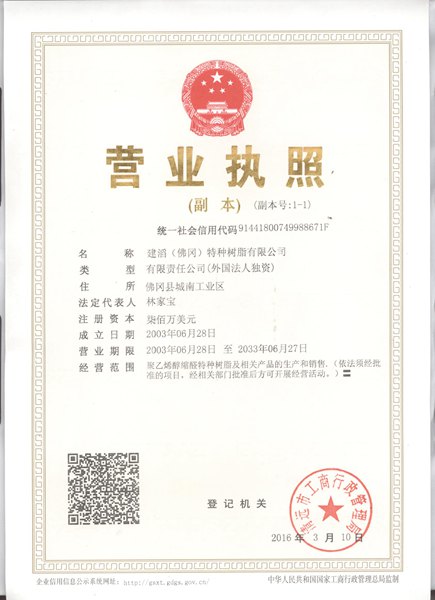 建滔(佛冈)特种树脂有限公司是香港建滔化工集团的全资企业,成立于2003年,公司产品为聚乙烯醇缩醛系列树脂和夹层玻璃用PVB树脂和胶片,其规模和工艺水平名列国内前茅,享有自主知识产权保护。生产线上的设备由世界有名有经验生产厂家生产,性能可靠;在线自动控制系统及检验仪器,居同行之首。其质量管理体系已获ISO9001:ISO14001,TS16949认证。公司产品完全符合国家安全玻璃检验中心检验标准,也符合所有全部安全玻璃标准,包括ANSI Z97.1,ECE R-43,EN 12600&12543,UL752等,胶片性能有保障。公司产品完全为纯树脂生产,绝不添加边角垃圾料。 本公司占地面积为14800多平方米,厂房面积为17071平方米。公司现有人员150多人,其中大中专以上人员占公司总数的40%以上。 集团背景 香港建滔化工集团于一九九三年在香港交易单位上市,现时为大部分国家非常大覆铜面板生产的跨国企业之一。集团自一九八八年成立靠前间生产覆铜面板的工厂以来,一直积较进行垂直和横向双线发展。目前集团分厂已超过四十间,拥有雇员37,000多人,年销售额超过十亿美元。经营范围已由覆铜面板发展至印刷线路板、化工产品、铜箔、玻璃纤维布、玻璃纱、漂白木浆纸、液晶体显示屏及磁电产品等多个领域。 集团殊荣 自2000年来连续六年获《福布斯》杂志选取为大部分国家二百家较佳小型企业之一,位居第5; 获《亚洲周刊》“2005年全部华商500强”排行榜第78位; 在Asia Money杂志举办之机构投入资金者调查中获选为香港二十家较佳管理公司之一。 纳入摩根士丹利资本全部环球指数成分股;花旗银行选为2002年亚太区较佳小型企业。