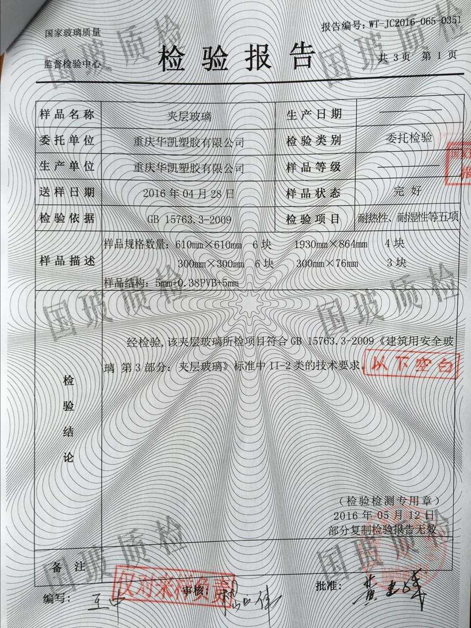 重庆华凯塑胶有限公司 于2010年5月26日正式注册成立,占地面积36000平方米,厂房面积20000多平方米,固定资产5000余万元,总投入资金9600万元金额,是重庆市靠前家、PVB树脂、PVB玻璃中间膜有经验制造商企业。???? 目前拥有五条生产线,二条PVB树脂粉生产线,三条PVB胶片生产线,年产PVB树脂9000余吨,PVB胶片10000吨,华凯企业是国内较有规模的PVB生产厂家之一,有经验生产建筑、汽车、光伏、彩色、隔音、防爆等各种PVB胶片。我们承诺全部华凯牌PVB胶片均为100%全树脂粉生产,绝不添加任何回收料。?公司以“顾客满意是永恒的宗旨,持续改进是不懈的追求”为质量方针,凭借成熟的工艺和的产品质量在客户中树立了良好的口碑,可为广大客户提供品质优越、规格齐全的PVB膜片。???? 公司先后通过了ISO9001全部质量体系认证、ISO14001全部环境体系认证及CE认证,荣获了“重庆市高新技术企业”称号;华凯牌PVB膜片还荣获了“重庆市品牌产品”的称号。?????我们尊重自然、生命、安全、与人和睦相处、精诚合作。正是这种坚定的信念,缔造了华凯不凡得品质。一直以来,华凯填补了多项国内技术空白,成为行业拥有高新技术较多的企业之一。以“科技创新,敢为人先”的企业精力和真诚的服务理念,我们将会以更高更远的目标发展、会以更的品质赢得人们的信赖与支持!为了更高更美好的目标,让我们携手共进,拥抱未来!